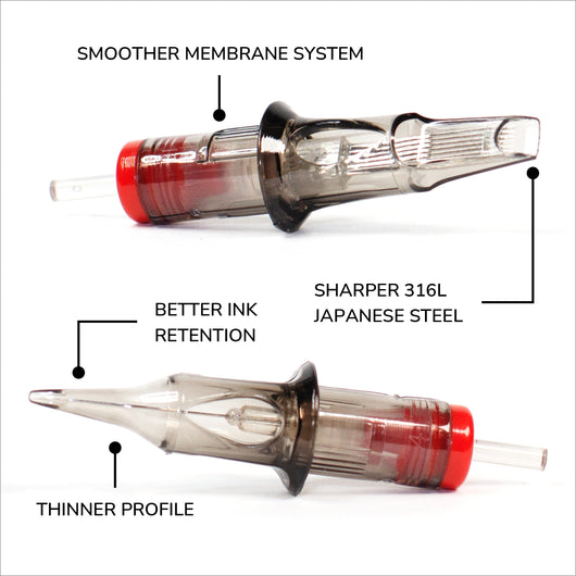 Legend's Hero Cartridges are designed with a smoother membrane system, thinner profile, stronger 316L Japanese stainless surgical steel and a specialized design to hold more ink than conventional tattoo cartridges. A first of its kind, these cartridge needles will help draw more ink and allow you to pull longer crisp lines, better shading, and color blending.